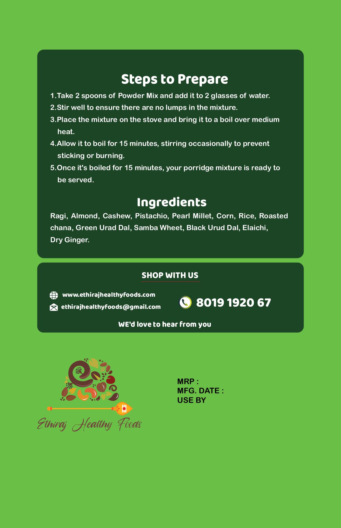Ragi, Almond, Cashew, Pistachio, Pearl millet, Corn, Rice, Roasted Channa, Green Urad Dal, Samba Wheet, Black Urad Dal, Elachi, Dry Ginger.