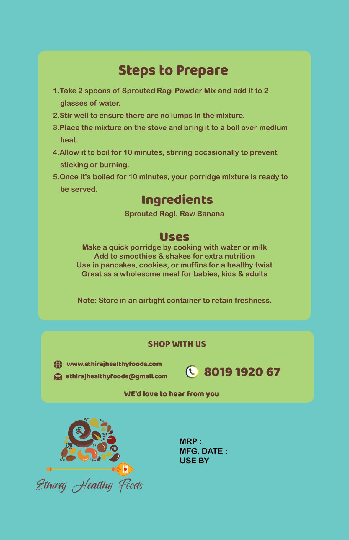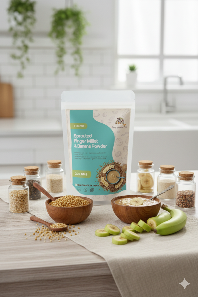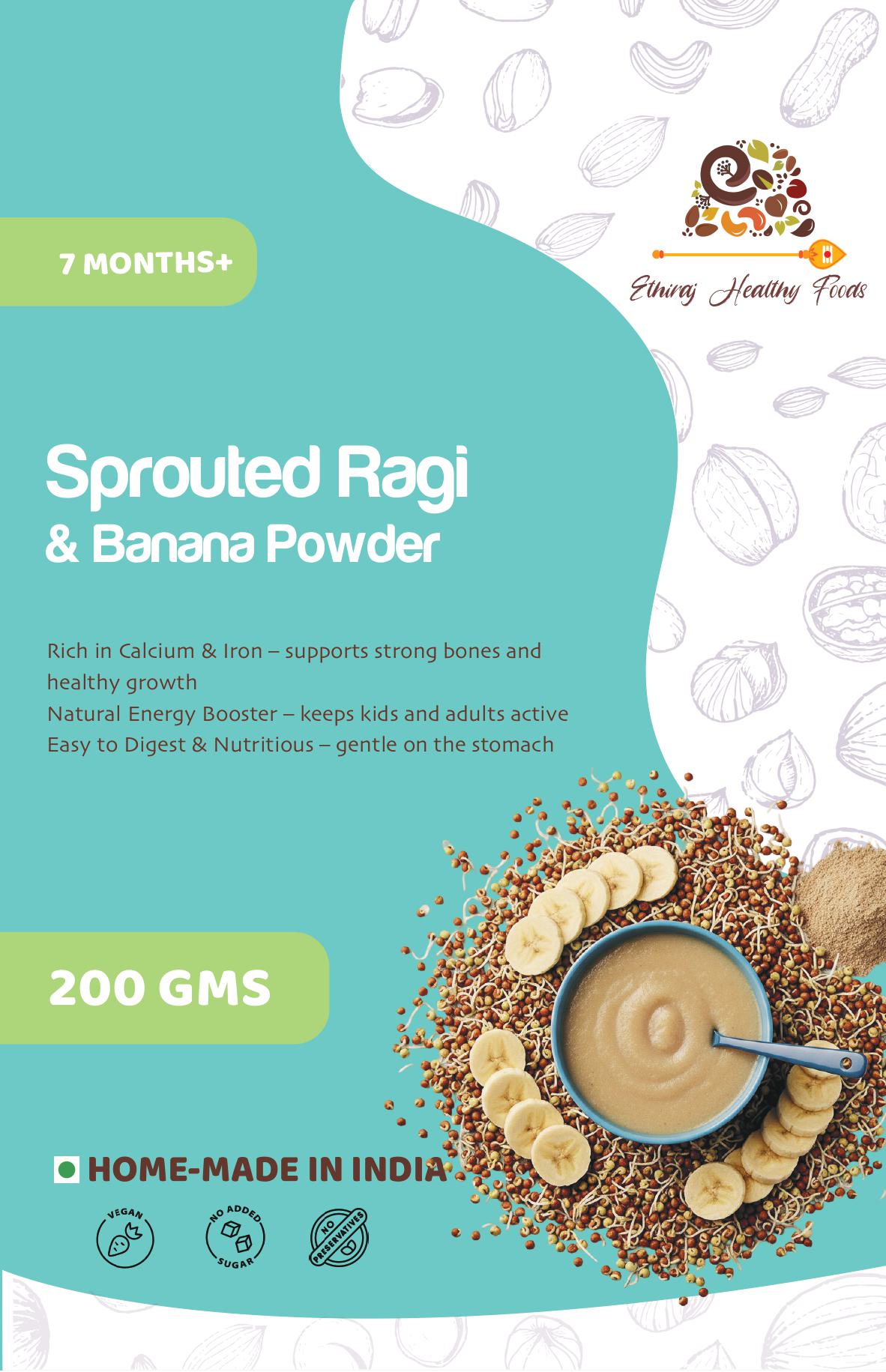 Sprouted Ragi and Raw Banana Powder from Ethiraj Healthy Foods is a power-packed blend that combines the calcium- and iron-rich benefits of sprouted ragi with the digestion-friendly energy of raw bananas. This wholesome mix supports strong bones, steady growth, and overall wellness, making it an ideal choice for babies, children, and adults. Easily prepared into a smooth porridge or added to milk and smoothies, it is 100% natural, free from preservatives, and offers pure nutrition in every serving.